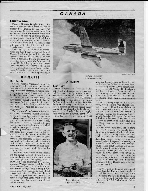 Time news story of first test flight of jetliner with photo of aircraft and test pilot James Orrell and discusses Walter N. Deisher