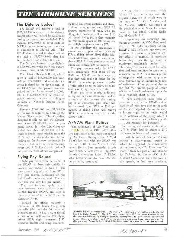 pg 65-66 The Defence Budget - Budgets for armed forces outlined including Defence Research board budget that coves development of CF-105 and Sparrow air-to-air guided missiles. A/V/M Plant Retires from RCAFGeneral Notes