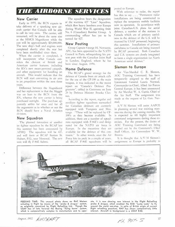 pg 37-39 Slemon to Europe - Air Vice-Marshal C.R. Slemon, AOC Training Command temporarilyu assigned to the staff of Lieutenant General Norstad, Commander-in-Chief, Allied Air Forces Central Europe, it's thought the assignment is likely to groom him to replace Air Mashal W.A. Curtis as Chief of the Air Staff - story also names Chief of Staff, Logistics and Personnel is the RCAF's A/C/M John L. Plant. Home Defence - discusses the use of the CF-100 and plans to replace Vampires and Mustanges with CF-100's. Change of Command - Squadron Leader Doulas Warren, DFC named commanding officer of 410 Fighter Squadron.General Notes