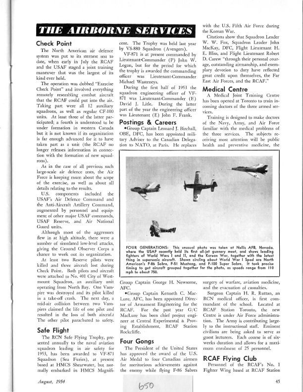 Pg 45/46 - Check Point - discusses Operation Check Point which included CF-100 units. Blast Off - CF-100 flown by Flying Officer John Reid, had his windshield shatter at RCAF Station North Bay airshow. Has additional pages that should be removedGeneral Notes