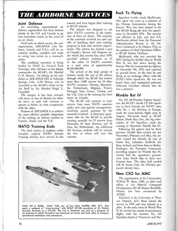 pg 46-47 Nimble Bat IV - 419 Sqn to leave Canada for NATO duty with No 1 Air Division in Europe. An Iroquois Occasion - first public showing of the new Iroquois turbojet with image.General Notes