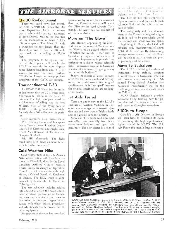 pg 55-56 CF-100 Re-Equipment - contract for CF-100 mk 5, More on "The Glove" - Velvet Glove update. Jet Aids Tested - anti-gravity suits and ejection seatsGeneral Notes