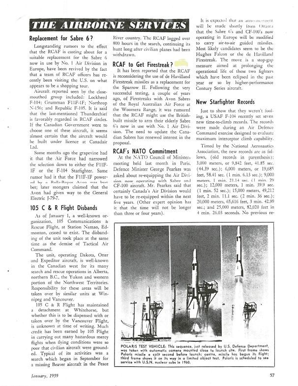 pg 57 - RCAF to get Firestreak - Firestreak possible replacement for the Sparrow 2. RCAF's NATO Commitment - Pearkes states CF-100 to be replaced within five yearsGeneral Notes