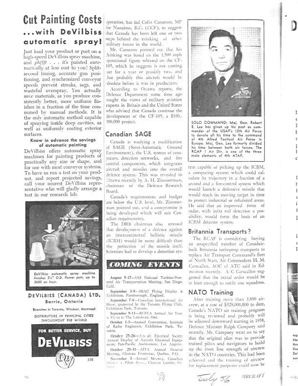 pg 96 The New Auxiliary - talks aobut CF-100 no longer in consideration for RAF. New Squadrons - three new all-weather interceptor squadrons to be equiped with CF-100's. pg 98 - Canadian SAGE - Canada studying a modification of SAGE which integrates aircraft and missiles into the overall defence system. Outdated? - An article about US armed force comment that he CF-100 is “quite slow”General Notes