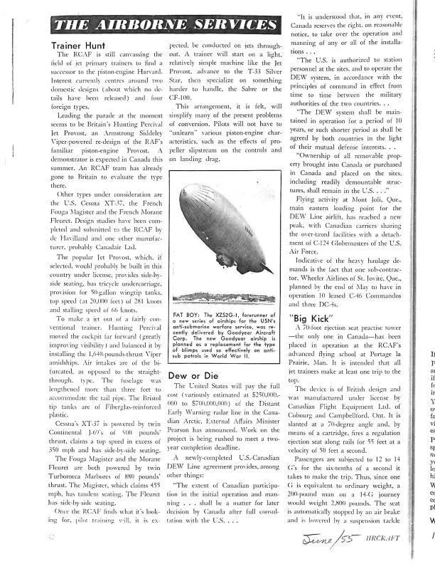 Pg 42 Trainer Hunt - looking for an aircraft for pilots to train on prior to moving to the Sabre or CF-100 Canuck. pg 44 - More Squadrons - RCAF announces 423 and 425 based at St. Hubert, 419 at North Bay and 428 at uplands. Comets Returning - Comets being assessed for repair, or restriction due to severe altitude problems.General Notes