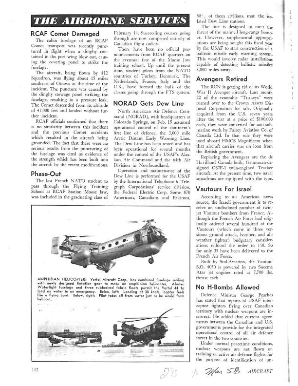 pg 112-113 No H-Bombs Allowed - Defense Minister Pearkes confirmed that in peace time no nuclear weapons would be flown across Canadian airspace. NORAD Gets Dew Line - An announcement that NORAD assumed control of the 3000 mile early warning system. Also money was being for installation f radar systema capable of detecting missiles 3000 miles away.Publication Details