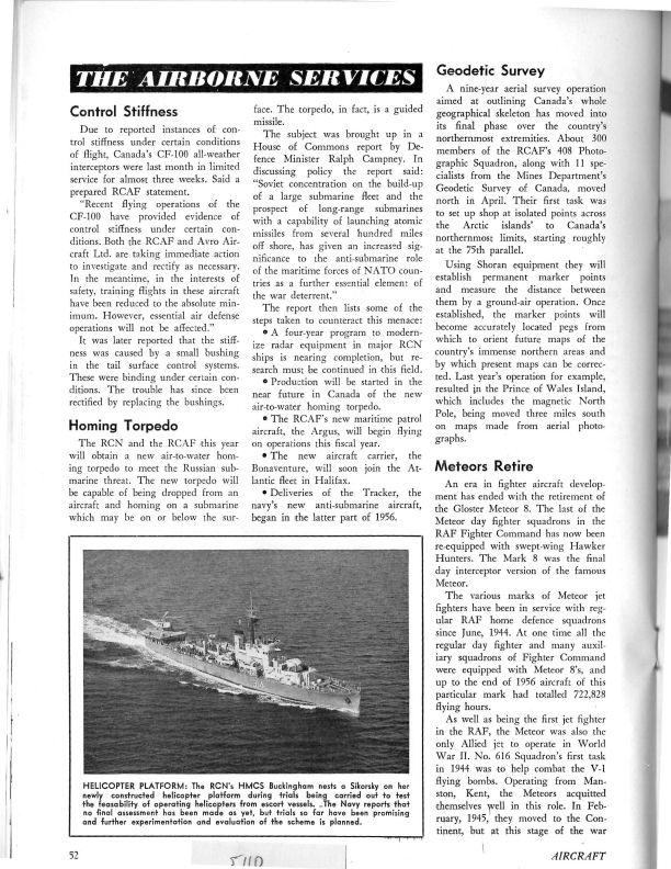 pg 52-56 Control Stiffness - The CF-100 showed signs of stiffness in the tail caused by a bushing. CH-100s at Dutch Fly Pass - image of Cauncks in flight. CF-100 Units postponed - 3 additional squadrons put on holdGeneral Notes