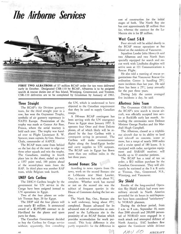 pg 46-47 Second Bomarc Site - LcMacaze near Mont Laurier, Que is only 5% complete. North Bay, ON is about 45% complete. Sky Shield - Operation Sky Shild which had every non-military aircraft in North America grounded in mid-September was considered satisfactory by NORAD planners. The nine Canadian units listed as defenders where CF-100 squadrons.General Notes