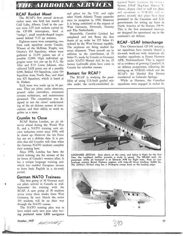 pg 93 1. RCAF Rocket Meet-The RCAF's first annual air to air rocket meet was held in September at Cold Lake, Alberta. Used in the contest were 2.75 inch rockets carried by CF-100 interceptors fired at "radops", small torpedo-shaped targets towed behind T-33 jet trainers. Ottawa's 410 Squadron was the winner out of 18 teams competing. 2. Bomarc for RCAF? The RCAF is studying the possibility of using U.S-built Bomarc IM-99 guided missles under the newly-established integrated North American Air Defence System. 3. RCAF-USAF Interchange Two Ottawa based CF-100 interceptor squadrons recently shared a six-week work-out with American all-weather squadrons at Ernest Harmon AFB, Newfoundland. This follows the setting-up of Norad which saw the RCAF's Air Marshal Roy Slemon transferred to Colorado Springs.General Notes