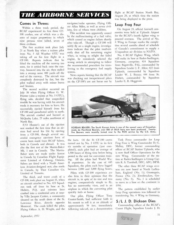 page 31 Comes in Threes - News item concerning that within a three week period the R.C.A.F. experienced its first three CF-100 crashes in which nine persons were killed- seven of them civilians.General Notes