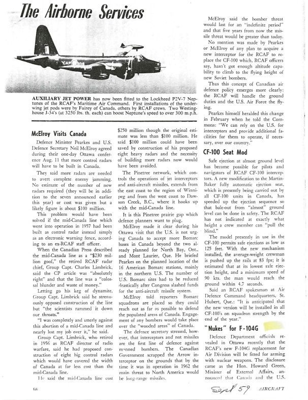 pg 68 - McElroy visits Canada - Canada to beef up radar, interceptors and not missiles are the primary defence against bombers; story includes reference to the scapping of the Arrow Project, Pinetree Network and deployment of Bomarc missiles. CF-100 seat Mod - New ejection seat permits low elevation operationGeneral Notes