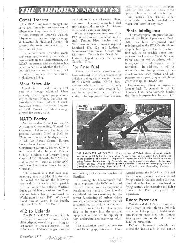 From Aircraft 1955 Dec pg 57 - Comet Transfer - Second Comet moved to Ottawa, been in storage for two years due to pressurization issues. More Sabre Aid - Canada to provide Turkey with additional SabresGeneral Notes