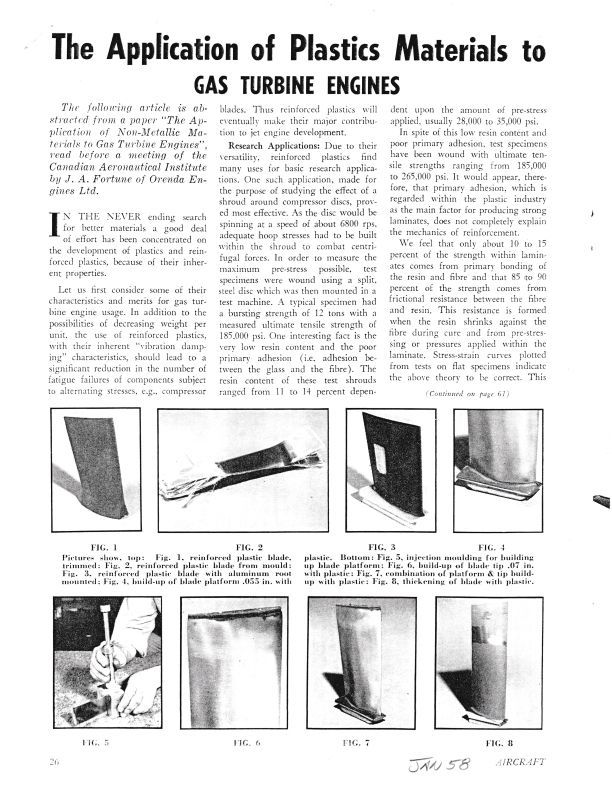 pg 26, 61, 62 Abstract of a technical paper presented by J.A. Fortune of Orenda Engines Ltd. concerning the development of reinforced plastics for use in aircraft manufacture. Included is an account of Orenda's experience using reinforced plastic blades in engines.Publication Details