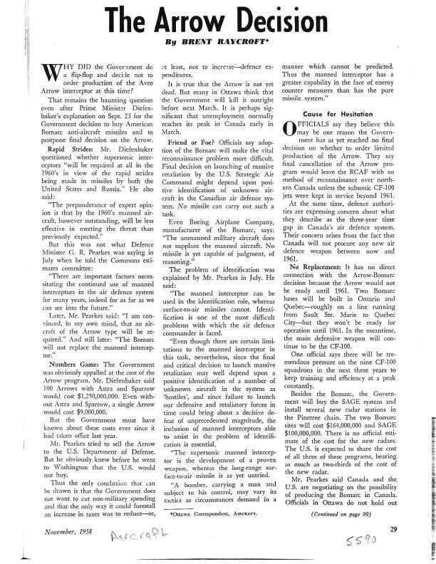Reporting on the decisions, explanations and thinking of the government at the time the Arrow project was being assessed for cancellation. Includes the Bomarc, George Pearkes, CF-100, SAGE and Pinetree chain (line)Publication Details