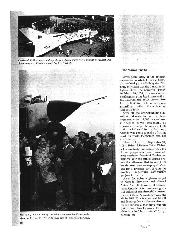 Short article by an unnamed author in an unidentified publication concerning the cancellation of the Arrow project. Article details that six former Avro engineers started up Avian Aircraft Limited and developed a vertical-take-off plane in 1962.