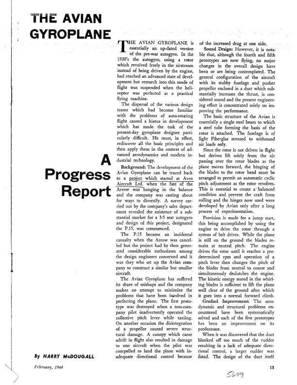 Pgs 12-14, 30-31 Magazine article about the development of the Avain gyroplane that originated as Avro Aircraft project P.15 shortly before the cancellation of the Arrow. Includes photo.Publication Details
