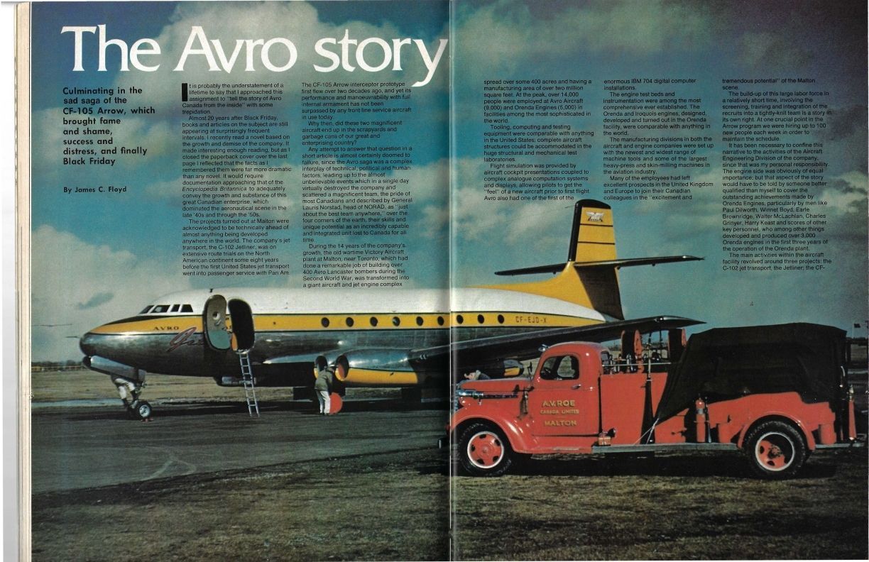 The Avro Story Article by James Floyd, overall history of A.V.Roe development, success, demise. Includes the Jetliner, Canuck and Arrow. - from Canadian aviation 1978 pgs 54-60, 126-131. Names include Edgar H. Atkin, Bill Baker, Winnet Boyd, Frank Brame, Earle (Earl) K. Brownridge, Allan Buley, James "Jim" Arthur Chamberlin, T.P. Michael "Mike" Cooper-Slipper, Waclaw Czerwinski, Walter Nice Deisher, Paul B. Dilworth, Roy Hardy Dobson, James "Jim" Charles Floyd, John Carver Meadows Frost, Crawford (Jr.) Gordon, Charles Grinyer, Guest Hake, S.E. (Stan) Harper, John Hodges, Bob Johnson, Frances Henry "Harry" Keast, Robert N. (Bob) Lindley, Carl Lindow, Peter Martin, Walter R. McLachlan, Joe Morley, John Morrison, Jimmy Orrel, Mario Pesando, John L. Plant, Donald "Don" Howard Rogers, Harvey Smith, Frederick "Fred" Thomas Smye, Dixon Speas, Murray Willer, Janusz "Jan" Zurakowski.Publication Details