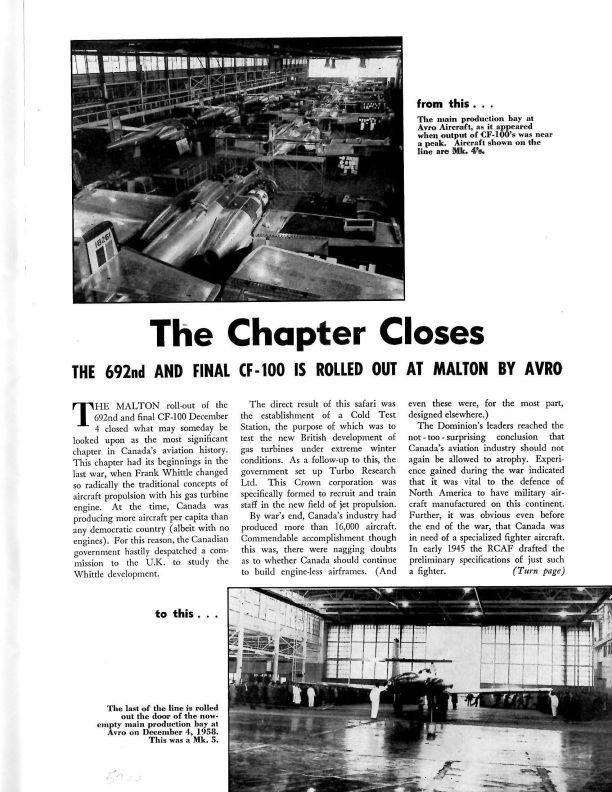 pg 17, 18, 20 - Magazine article with photographs recounts the history of the CF-100 programme from its beginning to the completion of the final Mk. 5 in 1958. Frank Whittle; Turbo Research Ltd.; Victory Aircraft Ltd.; Air Vice Marshal A.L. James; Squadron Leader Bill Waterton; Mutual Aid Agreement; Bristol Aircraft (Western) Ltd.; MacDonald Bros. Aircraft Ltd.Publication Details