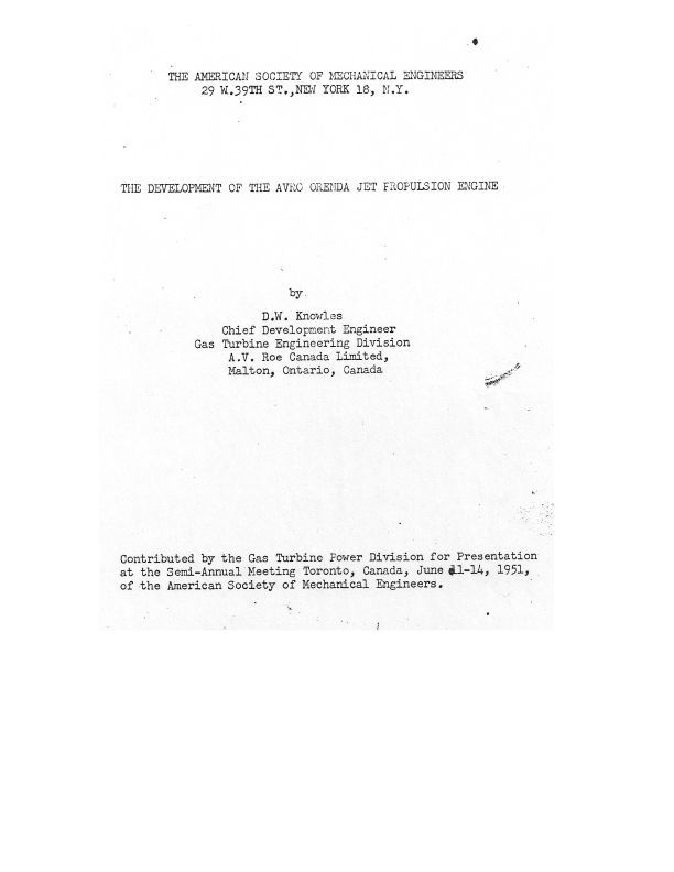 Narrative discussion of the development over 4.5 years of the Orenda Jet Engine by Avro Canada - Presentation to the American Society of Mechanical Engineers by Gas Turbine Engineering Division