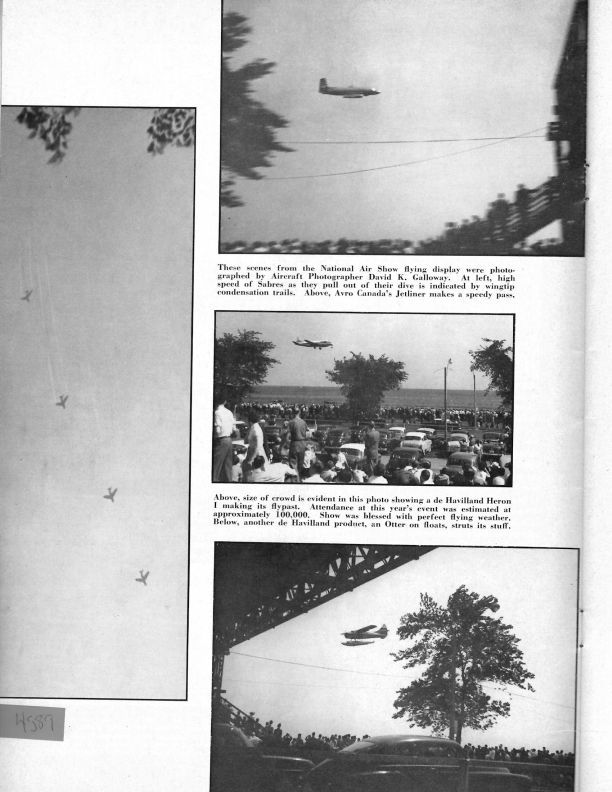 Photo of Jetliner on page 18, story on page 19 - story includes reporting on the Avro Jetliner flyby and photo of inflight aircraft. The article further surmises what will be the eventual fate of this pioneer aircraft. Avro Canada's Jan Zurakowski put on a "sparking" session of CF-100 Aerobatics.General Notes