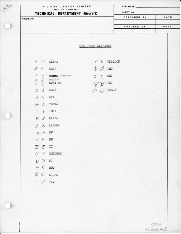 Page with typing an handwritten notation listing the letters of the Greek alphabet and theirsymbols. Issued by A.V. Roe Canada Ltd. Technical Department.