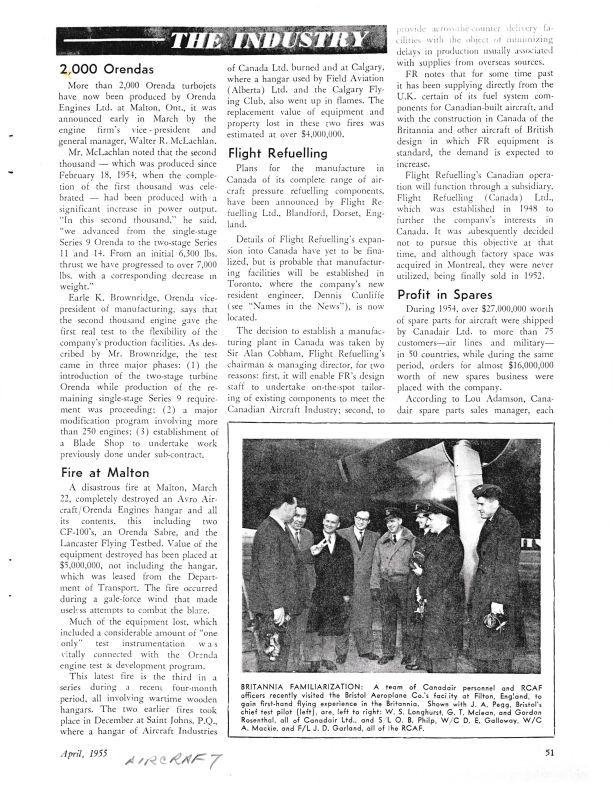 pg 51 -2,000 Orenda - second thousand produced since Feb 18, 1954. Fire at Malton - details of the fire that destroyed an Avro/Orenda hanger, Lanc test bed and CF-100's. pg 52 - $396, 740.09 for a Saucer - Article details Canadian government early investment in Avro saucer projects (Avro Car / Project Y). pg 53 - More Layoffs at Malton - Lay-offs by Orenda at Malton / Winnett Boyd's new company.Publication Details