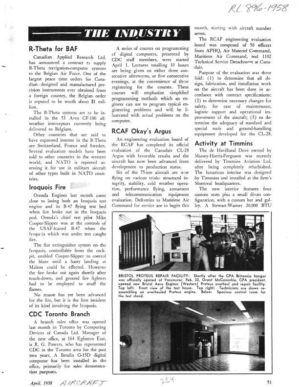 pg 51 R-Theta For BAF - Canadian Appl;ied Research Ltd to provide nav computer to Belgian Air Force. Iroquois Fire - Orenda Engines last month came close to losing both an Iroquois test engine and its B-47 test bed when fire broke out in the test pod. Mike Cooper-Slipper was at the controls when the engine caught fire. Cooper-Slipper was able to control the blaze with fire extingusher system from the cockpit until he was able to land.General Notes