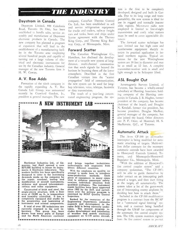 pg 48, 51 A.V. Roe Adds - New subsidiary, Canadian Thermo Control Co. Ltd. Formed. Automatic attack - CF-100 equipped with automatic attacking capability. Contracts awarded - Avro recieves contracts for aircraft spares & aircraft ejection seat sparesGeneral Notes