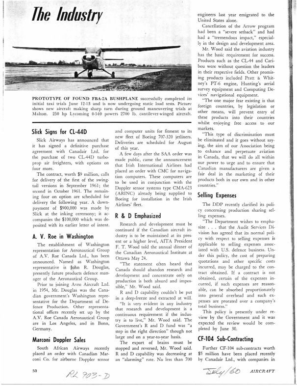 pg 50 A.V. Roe in Washington - John R. Douglas named Washington rep, other reps in LA and Bonn Germany. Comment made about serious setback to industry due to Arrow cancellation. pg 52 - Mid-Canada Price Tag - Total cost of the Mid-Canada warning line was $227,718,302, Defence Production MinisterO'Hurley reported to the commons on March 28.General Notes