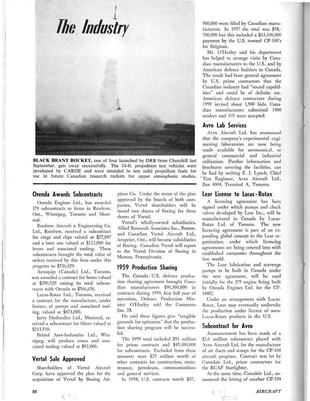 pg. 50-54 - Orenda Awards Subcontracts - report that Orenda Engines Ltd. had awarded contracts to a number of Canadian companies totalling over $1.3 million. Avro Lab Services - announcement that Avro Aircraft Ltd.'s experimental engineering labaratories are being made available for aeronautical, commercial and industrial use. Subcontract for Avro - announcement that Canadair Ltd. had awarded a $2.6 million contract to Avro Aircraft Ltd. in connection with the CF-104 Starfighter aircraft program. Contracts Awarded include $562,151 to Avro for aircraft armament equipmentGeneral Notes