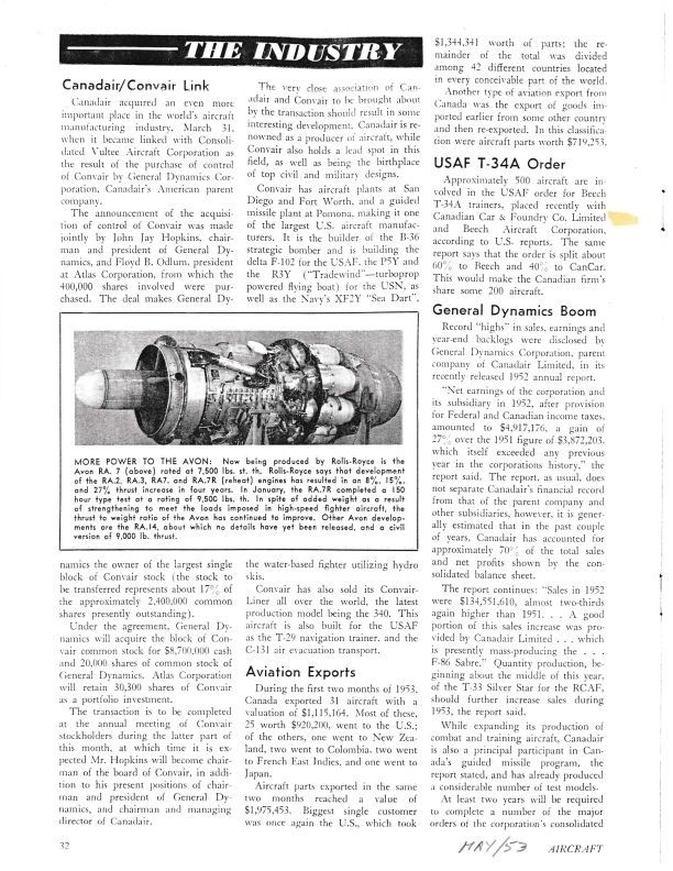 pg 32 USAF T-34A order - CanCar gets the order for about 200 planes. More Power to the Avon - image and story about new 7,500 lbs. static. thrust engine. pg 35 - 500 Sabres -A short article about the number of Sabres bought by the Canadian government. Ejection at 30000- A paragraph about the first live test of the Martin-Baker Automatic crew ejection seat at 30,000 ft, belived to be the highest altitude tested .General Notes