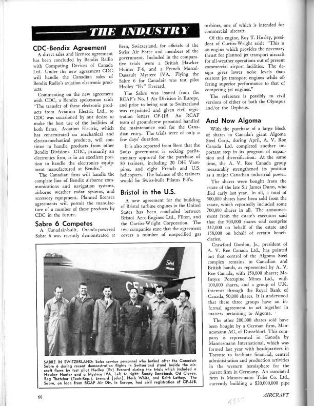 pg 66-70 Sabre 6 Competes - Canadair-built, Orenda-powered Sabre 6 demonstrated at Bern, Switzerland where it was given civilian registration letters CF-JJB. And Now Algoma - with the purchase of a large block of shares in Canada's giant Algoma Steel by A.V. Roe Canada. Titanium in Turbojects - Charles Grinyer, VP Engineering of Orenda Engines Ltd presented a paper at the SAE National Aeronautic Meeting in New York City. Change of Address - A.V. Roe Canada Limited announces its new offices at 170 University Ave, Toronoto will house Crawford Cordon, Jr.; Air Marshal W.W. Curtis; A.A. Bailie, VP Finance and Treasurer; W.H. Dickie, VP Industrial Relations; A.R. Williams, assistant to the president; H.W. Aitcheson, secretary; and George Caton-Jones, Comptroller. Canadian Jet Outlay - the Federal Gov't has paid or committed to pay $1,116,791,809 to three Canadian companies. Avro and Orenda between Jan 1, 1949 and Feb 28 1957 received $967,571,828. Of this $704,396,228 was spent on development and production of the CF-100. $99,351,396 was spent on research and development of the CF-105 Arrow. Short SC-1 VTOL image. CanCar Beech 73 Deal / Titanium in Turbojets / Change of Address - CanCar agreement to build Beech 73's, Titanium for use in Turbojets, change of address for A.V. Roe Canada Limited.General Notes