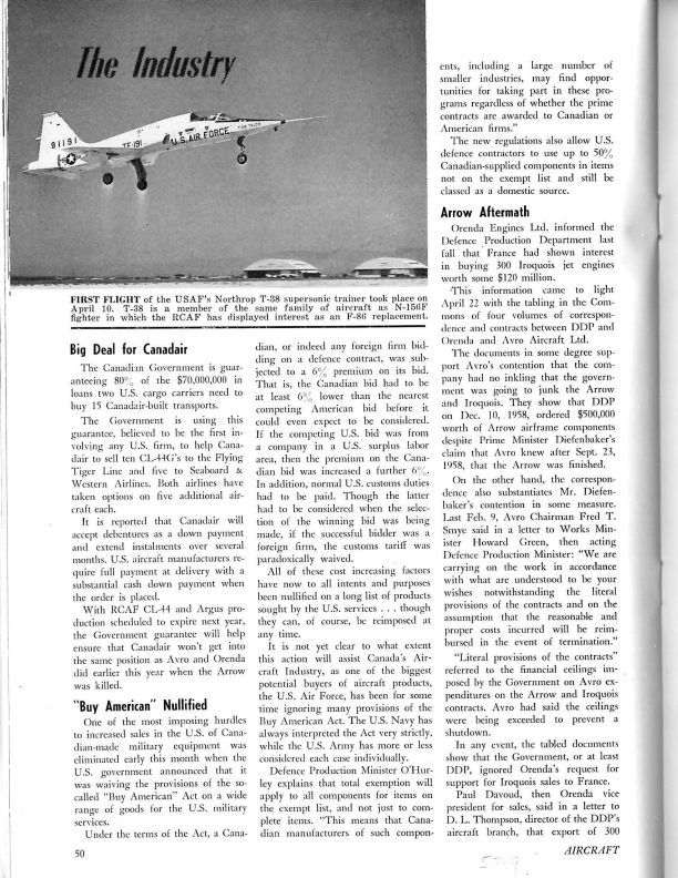 pg 50, 52 Arrow Aftermath - reports that France had expressed interest in buying 300 Iroquois engines from Orenda Engines Ltd. around the time of Arrow project cancellation. Reports of this interests to the Federal Government got no response. The deal could have saved the Arrow project. Story includes Fred T. Smye, Howard Green then acting Defence Production Minister, Paul Davoud then Orenda VP for sales, D.L. Thompson, director of the DDP's aircraft branch, J.A. Morley, VP for sales. Page 53 CARL Absorbs Phoenix - A. V. Roe Canada Ltd. merged Canadian Applied Research Ltd. and Phoenix Engineered Products Ltd. Into a single corporate entity which will continue in the name of CARL.General Notes