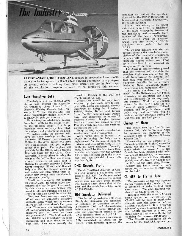 pg 36 Avro Executive Jet based on the McDonnell jet transport with CJ610 engines & Change of Name Discussion on Avro Canada becoming Hawker Siddeley Canada Ltd. Image of Avian 2/180 GyroplaneGeneral Notes