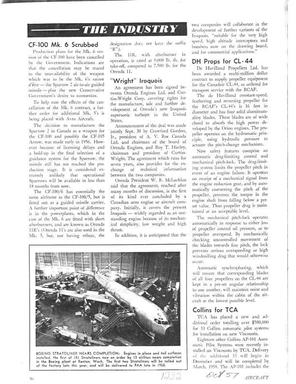 Page 86-CF-100 Mk. 6 Srubbed. A short article about the cancellation of the Mk 6 version and the production of Sparrow missles.General Notes