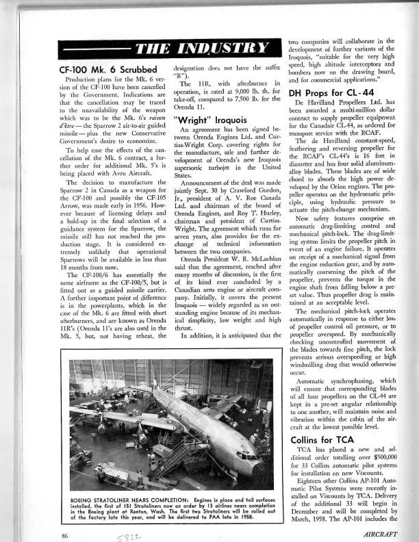 pg 86. CF-100 Mk. 6 Scrubbed - reports that the government cancelled the CF-100 Mk. 6 production program partly owing to failure of the Sparrow weapons system to achieve its production scgedule and partly for financial reasons. "Wright" Iroquois - announces a 7-year agreement between U.S. company Curtiss-Wright Corp. and Orenda Engines Ltd. for the further development, manufacture and sales of the Orenda Iroquois in the United States. pg. 88 - $8M Order to Orenda - German spare parts award.General Notes