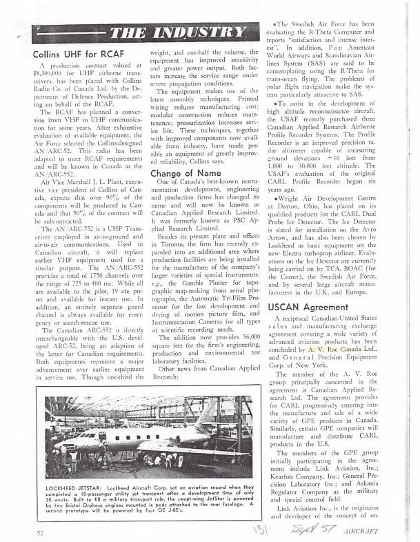 pg 52-53 Change of Name - PSC Applied Research Limited renamed to Canadian Applied Research Limited. USCAN Agreement - discusses reciprocal Canadian-US sales and manufacturing exchange agreement that included A.C. Roe Canada Limited.General Notes
