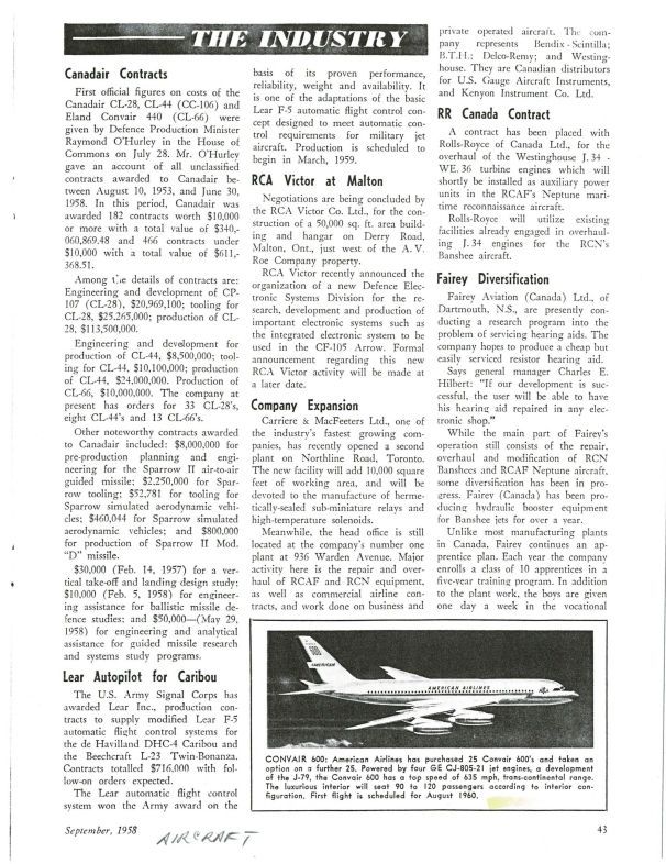 pg. 43 - RCA Victor at Malton - Setting up shop to provide electronics for the Arrow. pg 47 Government talks CF-105 - Future projects such as the CF-105 should be undertaken with partners, NATO of NORADGeneral Notes