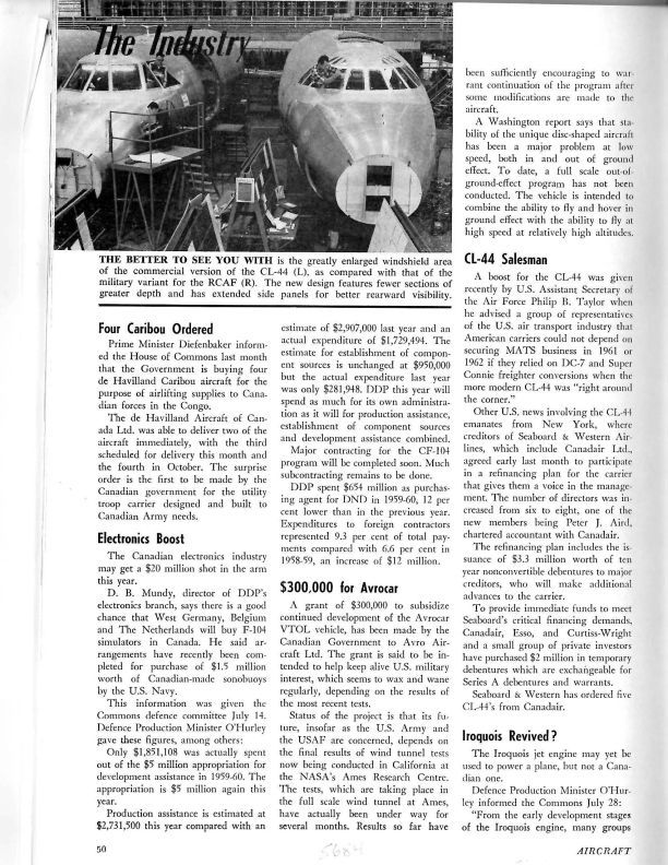 pg. 50-53 - $300,000 for Avrocar - Announcement that the Cdn. Government has granted $300K to Avro Aircraft Ltd. to subsidize continued development of the Avrocar VTOL vehicle. Iroquois Revived? - article stating that several aircraft production companies have expressed interest in partnering with Orenda Engines and the Cdn. Gov't to complete the development of the Iroquois engine. CF-104 Work to Avro - contract for the production of external fuel tanks for the CF-104General Notes