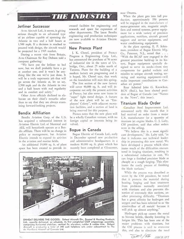 Pgs 54-55 Jetliner Successor, discusses potential 1,500 mph aircraft for the 1965 market, Titanium Blade Order - discusses Canadian Steel Improvement Ltd discusses Orenda PS-13 engineGeneral Notes