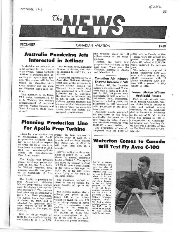 pg 55 Australia pondering jets interested in Jetliner - Trans-Australia Airlines looking at the Jetliner. Waterton comes to Canada will test fly Avro C-100 (with photo). pg. 56 - Jetliner Performance Up; C-100 to fly soon - C-100 scheduled to fly by years end; Jetliner testing is progressing with Don Rogers as pilot. / To Avro Canada - J.H. Berry, CMG, OBE appointed as Director of Manufacturing at A.V. Roe Canada Ltd.; Mr. Berry served with the Dept of Munitions and Supply under C.D. Howe during the war.Publication Details