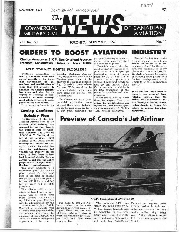 pg 97 Preview of Canada's Jet Airliner - Artist view of Jetliner, CF-100 progresses. Avro twin-jet fighter progresses.Publication Details