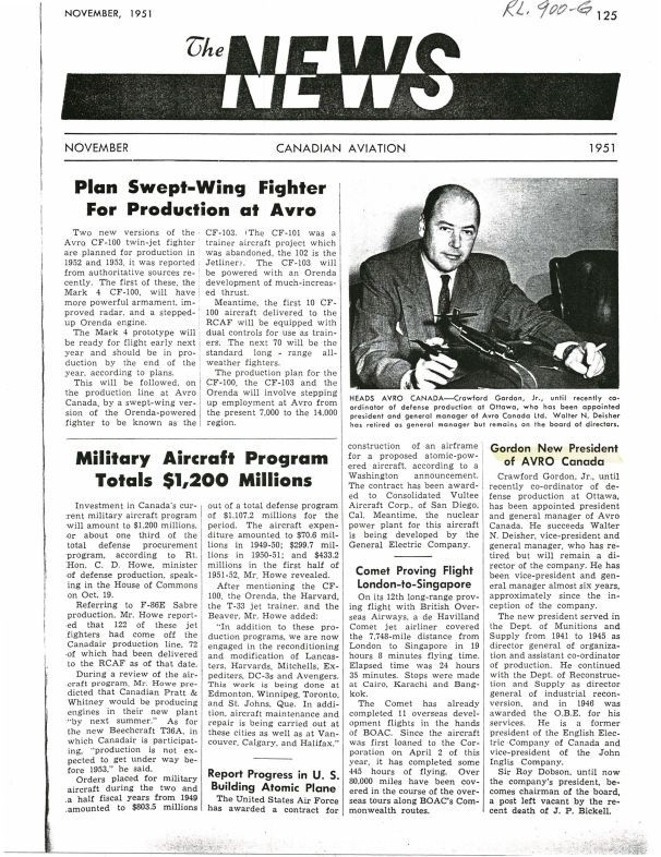 pg 125 Plan Swept-Wing Fighter for Production at Avro - discusses both the Mk 4 CF-100 and CF-103 with note that the CF-101 was a trainer aircraft. Gordon New President at Avro Canada - includes photo of Crawford Gordon, Jr. Names include J.P. Bickell, Walter Nice Deisher, Roy Hardy Dobson.Publication Details