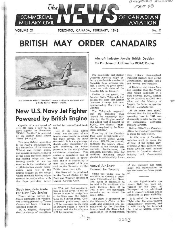 pg 71 - Annual Air Show Planned for Toronto - story about the plans to establish a new international air show in Toronto.