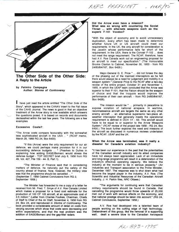 extract from Pre-Flight with some facts on the Arrow programme discussed. Names include Fred T. Smye, Mr. Pearkes (General).Publication Details