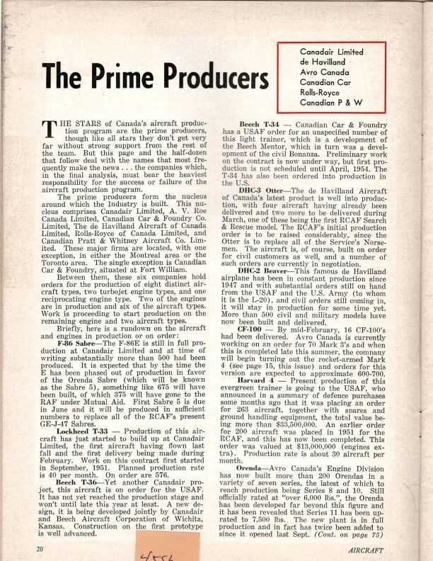 page 20 Story highlights the production activities of Canada's Prime Producers, including the CF-100, Avro Canada and Orenda.