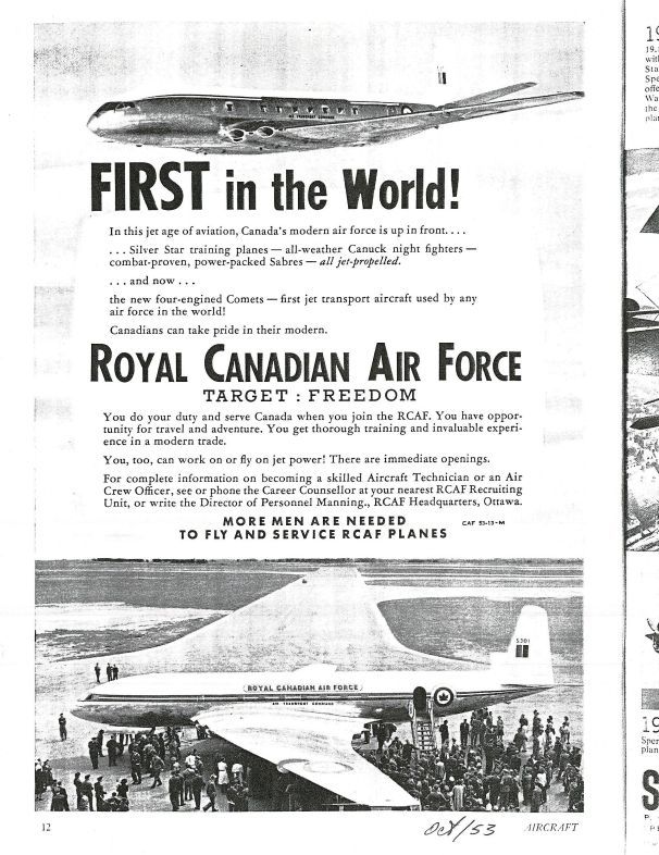pg 12, 50, 51 - Ad - "FIRST in the World! Royal Canadian Air Force - Target: Freedom" featuring Comet - Photo layout showing the various A/C of the RCAF including the CF-100 (FB-S and SA-138) and SabreGeneral Notes
