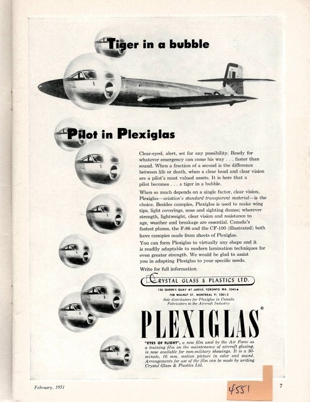 Pg 7 Advertisement for Crystal Glass and Plastics for Plexiglas used in the manufacture of Plexiglas canopies in the CF-100 pictured in the ad.General Notes