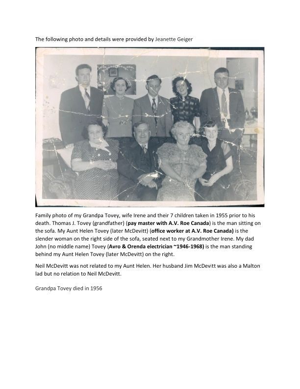 Family photo highlighting three Avro/Orenda employee's - Thomas Tovey -Pay Master, Helen McDevitt (nee Tovey) office worker and John Tovey who was an electrician with Avro and Orenda