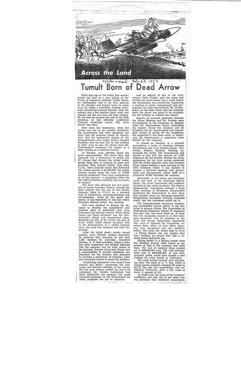 A summary of events iduring the week after cancellation. Includes cartoon with Dief tied to a Bomarc